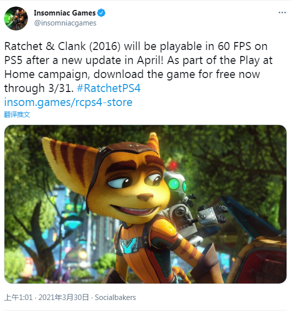 之前索尼开启了新一轮送游戏活动“Play At Home”,还没领的玩家要抓紧时间了,2016年推出的PlayStation独占游戏《瑞奇与叮当(Ratchet & Clank)》是赠送的免费游戏之一。近日该作的开发商Insomnic工作室宣布,《瑞奇与叮当》将于不久后推出PS5版本补丁。