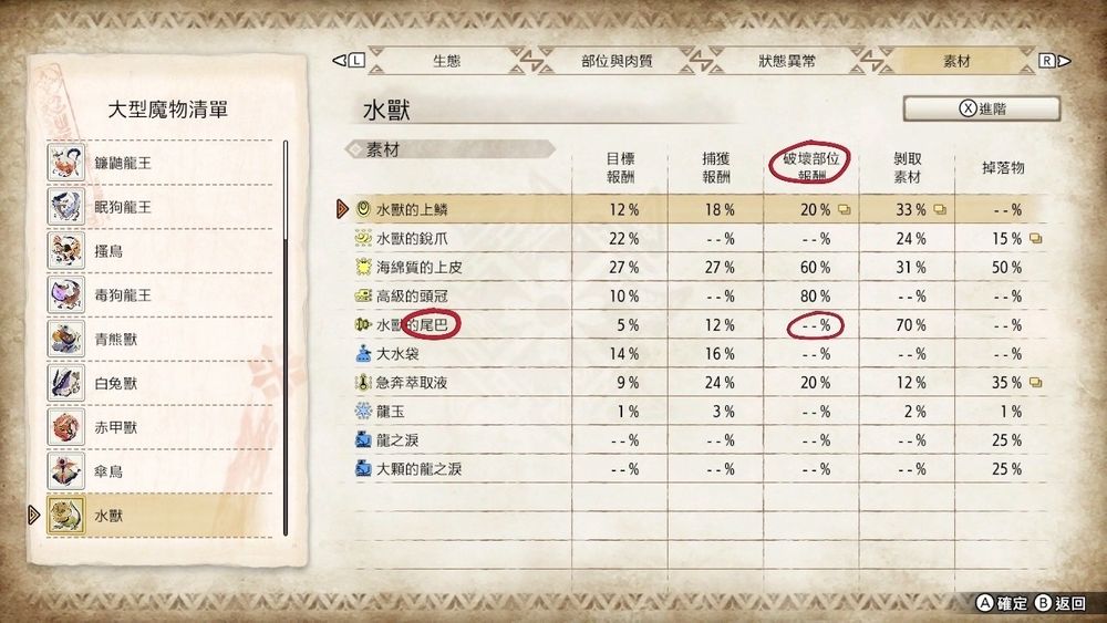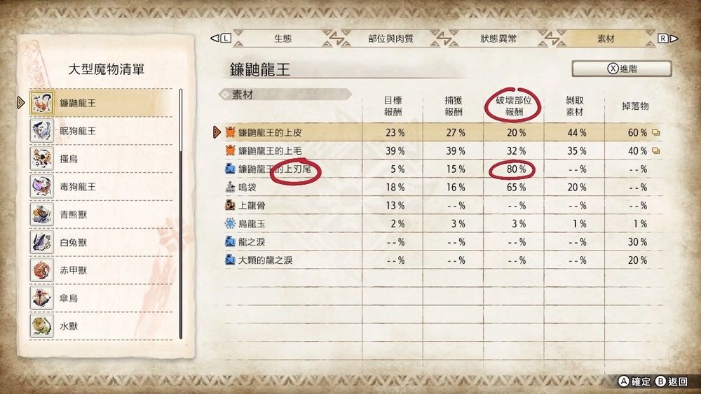 由上面猎人心得里面大型怪物的两张资料图可以看得出来,在尾巴素材的破坏报酬有机率性取得跟无法取得的两种情况。无法取得破坏报酬的尾巴素材意味着你需要用剥取的方式来取得(后面那一栏)。(这代表可以断尾)