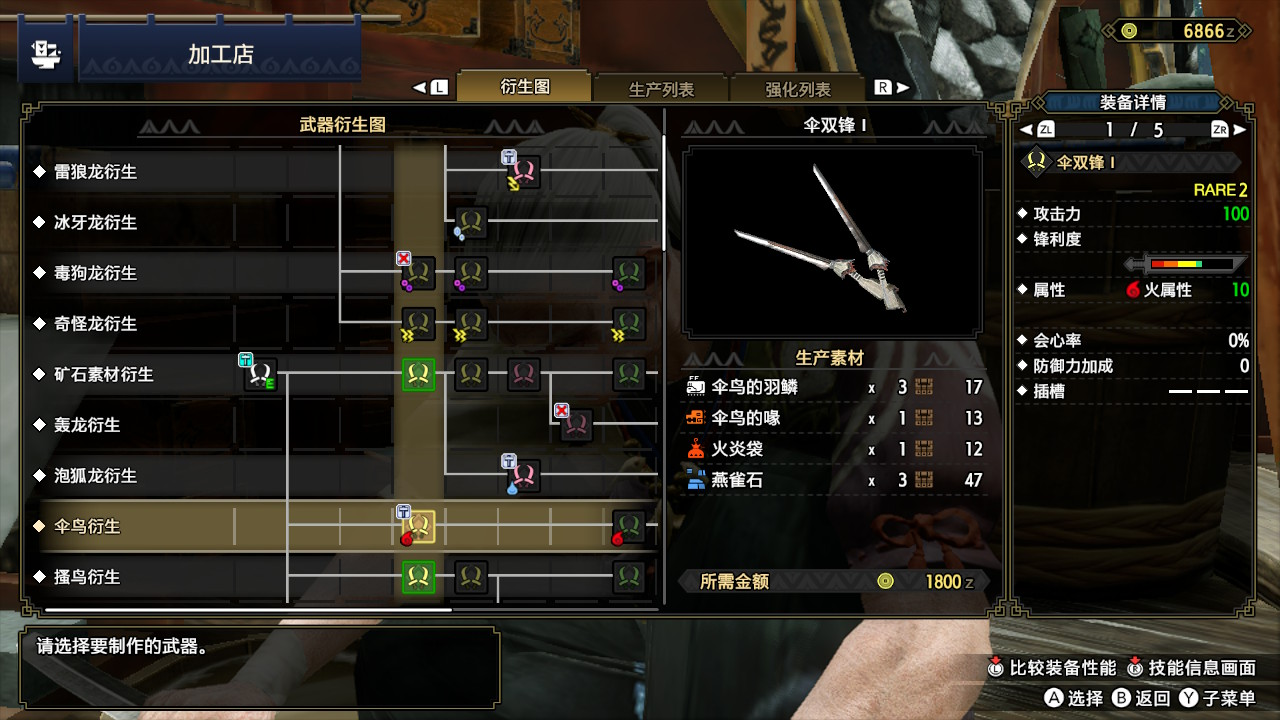 打完伞鸟后推荐做一把伞鸟的武器,攻击高、绿斩、带火属性,是这个阶段性能非常好的武器。尤其是接下来的三星,基本上全员弱火。而且如果懒得换武器的话,甚至可以一直用到打完怨虎龙。