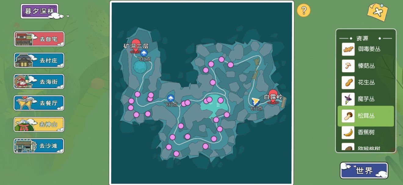 松茸主要分布在暮夕深林地图,而且该材料的刷新地点会随着时间而改变,白天一般在花生丛和姜丛中,而晚上则刷新在魔芋丛中,不过采集到的机率非常低,玩家需要花点时间去蹲点。