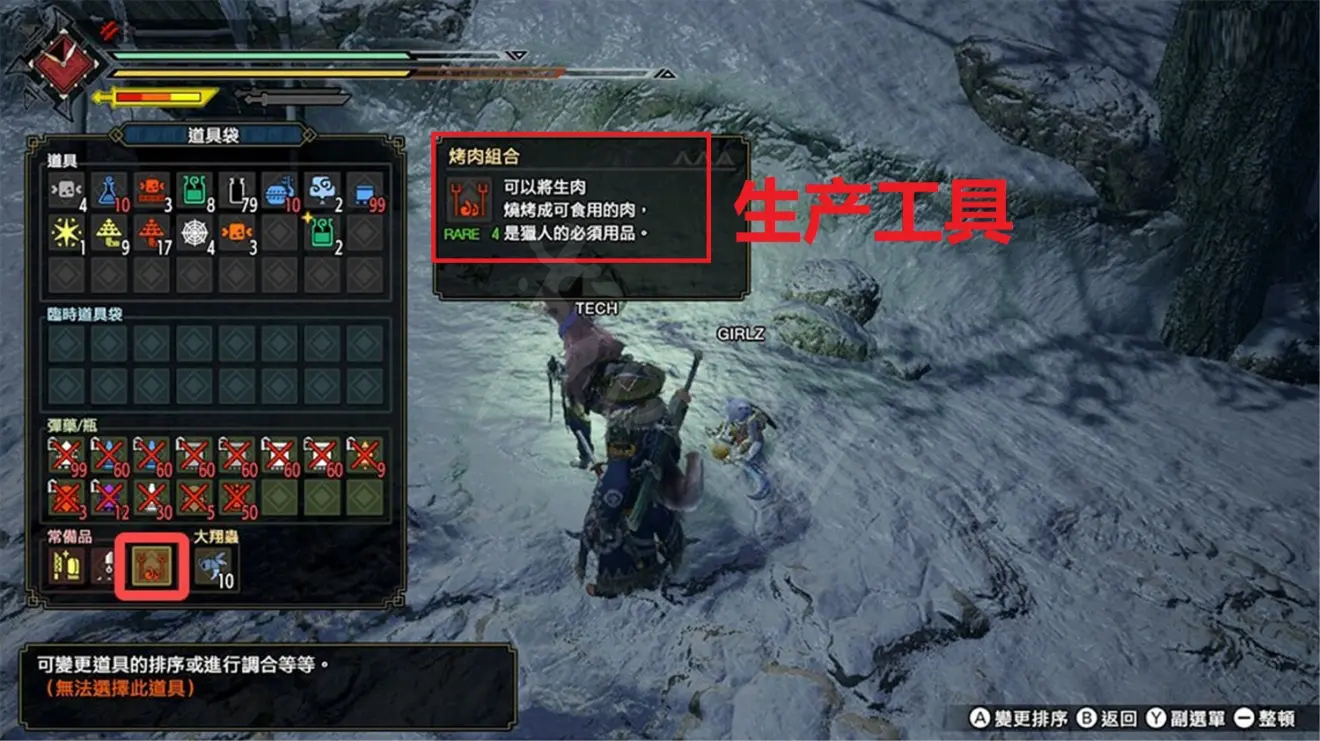 和现实生活一样,我们需要烤肉来喂饱肚子。在《怪物猎人:崛起》里烤肉有两个前置条件,一个是需要在任务模式下,因为这个时候才能使用“烤肉组合”;另一个则是道具袋里需要有“生肉”。前者就是所谓的生产工具,而后者则是生产素材,自然缺一不可。