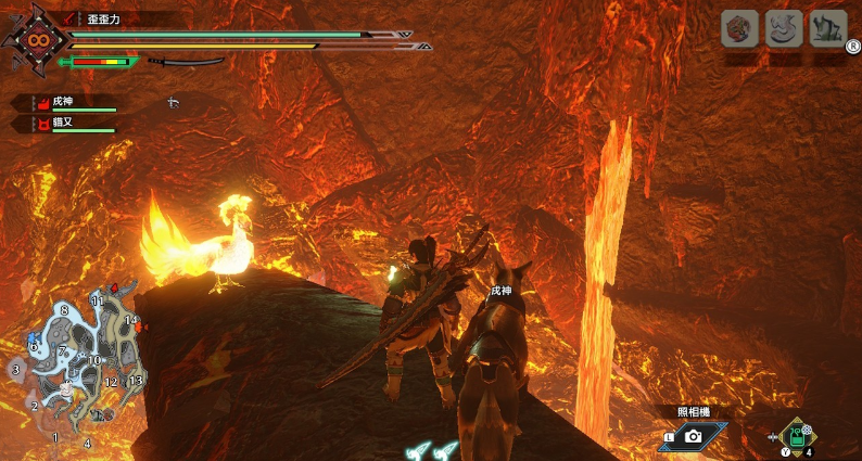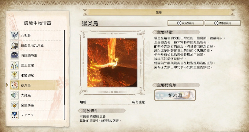 狱炎鸟只会出现在熔岩洞的夜晚,其位置在地图 11 号区域熔岩区的秘密通道。11 区域北方牆壁有个小洞,进入后利用翔虫攀登,即可来到熔岩峭壁,玩家应该发现狱炎鸟在悬崖处。