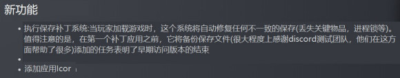 本次更新添加了一个提醒玩家EA阶段结束的任务,并额外添加了存档修复功能,这一功能会自动修补存档中的一些问题(比如某个关键物品丢失、卡进度)。