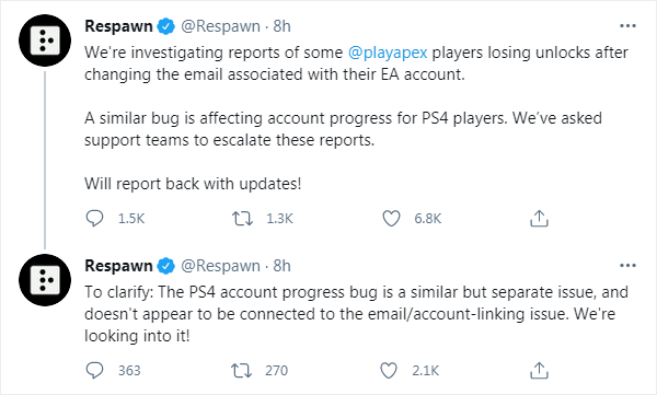 此前官方发推表示调查疑似更改EA账户绑定电子邮件会造成该问题,但随后否认电子邮件与账户进度重置是两个相似但独立的问题。他们正进行深入调查。