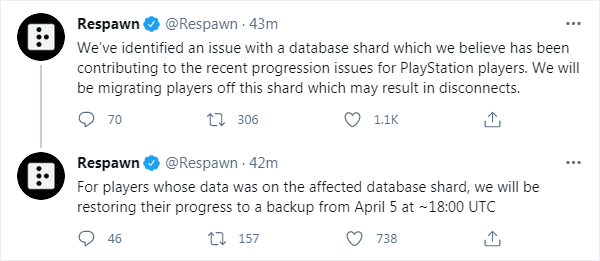 在下午重生表示他们发现了一个数据库碎片问题,他们认为这是导致PlayStation玩家最近游戏进度问题的原因。他们将把玩家从这个碎片中迁移出来,这可能会导致玩家断开连接。并且对于数据受到影响的玩家,他们将从世界标准时间(UTC)4月5日18:00起将其进度恢复为备份数据。