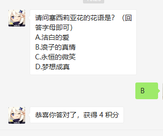 《原神》游戏中有很多的采集物,其中部分是花类植物,每种花都有自己的花语,今天的微信每日一题是:请问塞西莉亚花的花语是?下面小编就给大家带来《原神》2021年4月7日微信每日一题答案,一起来看看吧!