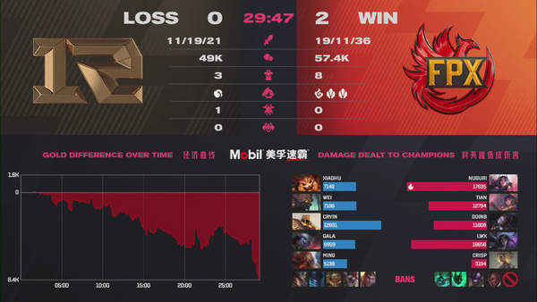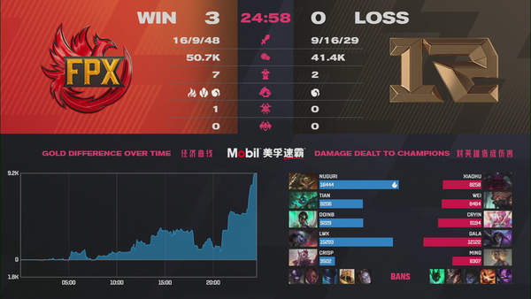 26分钟RNG主动开小龙,但Tian等级优势抢下土龙听牌,FPX直接转中推进,大龙刷新,FPX回头围绕大龙布置视野。随后,在上路Cryin沙皇配合Wei双召交出击杀莉莉娅,FPX及时支援反打4V5直接开团打出1换4,FPX拆掉基地拿下赛点!
