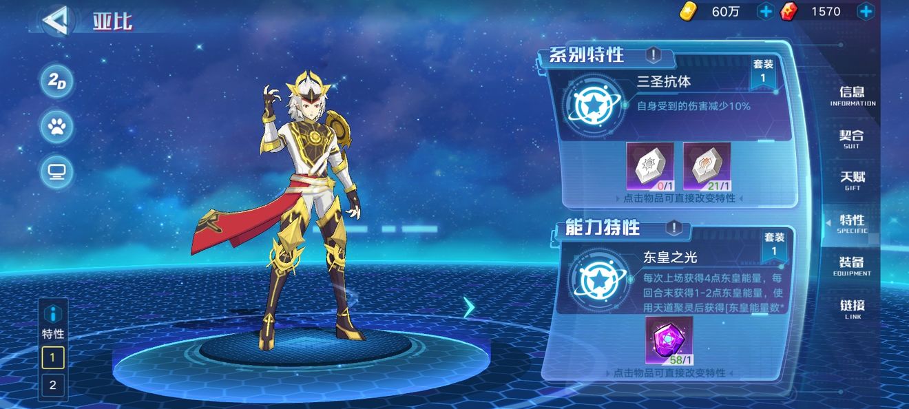 特性选择东皇之光和三圣抗体,由于东皇太一这坑爹的技能机制,续航能力极其差,只能从特性方面做文章,选择保命的特性东皇之光。另一个特性东皇太一是每回合33%概率提升暴击,每回合回复0~3点能量,极其不稳。