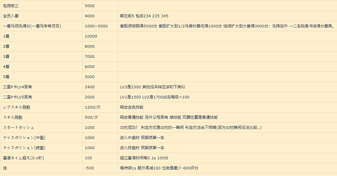 例如 第三场短距离1着进王合计基础得分 15000,首位 3连胜 支援卡系数1% 对手系数0.89 。得分为15000+15000*(0.1+0.03+0.01+0.89)=30450。
