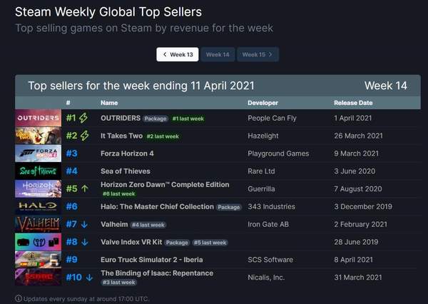 V社公布了上周(4月5日至4月11日)Steam平台的销售情况排行榜。Square Enix旗下的科幻射击游戏《先驱者》实现了连冠,虽然该作首发时遇到了一些问题,但是还是挡不住玩家的热情。合作游戏《双人成行》依旧保持第二名。第三名是赛车竞速游戏《极限竞速:地平线4》。