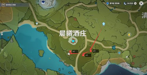 3、晨曦酒庄,共计7个慕风蘑菇,最优路线可获得7个,这个距离比较远,如果不是特别缺,前面几个路线就够了。