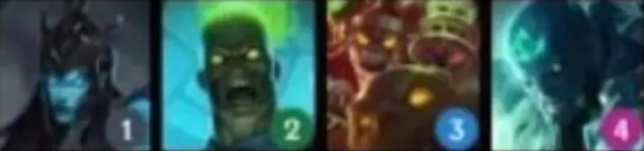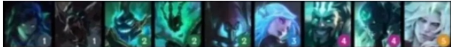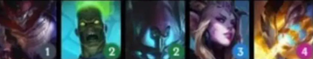 从左到右英雄分别为:薇恩(1)、沃里克(1)、赫卡里姆(2)、锤石(2)、维克多(2)、卡特琳娜(3)、德莱文(4)、瑞兹(4)、佛耶戈(5)。