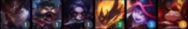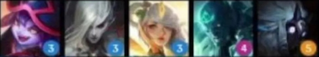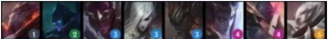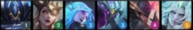 从左到右英雄:卡兹克(1)、乐芙兰(2)、卡特琳娜(3)、梦魇(3)、黛安娜(4)、佛耶戈(5)