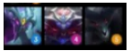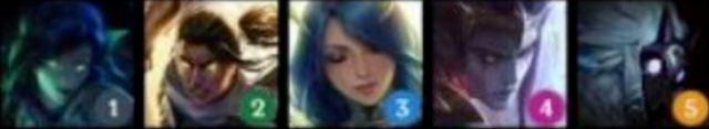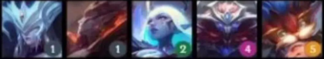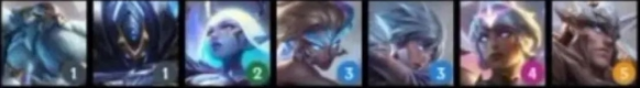 从左到右英雄:亚托克斯(1)、蕾欧娜(1)、辛德拉(1)、韦鲁斯(2)、拉克丝(3)、芮尔(4)、维克兹(4)、凯尔(5)