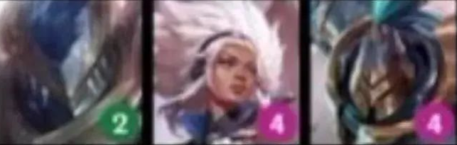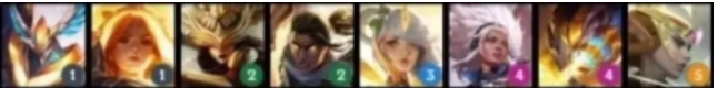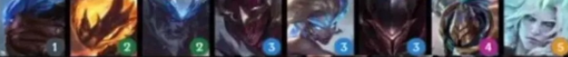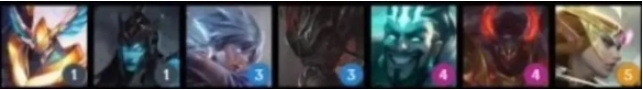 从左到右英雄分别为:弗拉基米尔(1),瑟庄妮(2),李青(3),莫甘娜(3),亚索(3),厄斐琉斯(4),黛安娜(4),德莱厄斯(5)