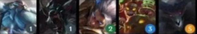 从左到右英雄:乌迪尔(1)、凯南(2)、特朗德尔(2)、李青(3)、奈德丽(3)、潘森(3)、贾克斯(4)、佛耶戈(5)