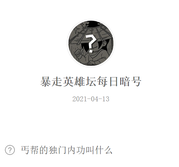 《暴走英雄坛》游戏中有很多的门派,每个门派都有自己独特的内功心法,今日《暴走英雄坛》微信每日暗号是:丐帮的独门内功叫什么?下面小编就给大家带来《暴走英雄坛》2021年4月13日微信每日暗号答案分享,一起来看看吧!