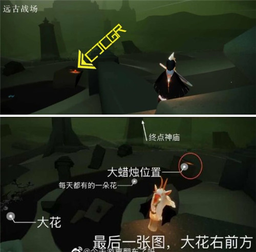 4、最后一个大蜡烛在墓土三龙图(远古战场)大花右前方的一个平台上。