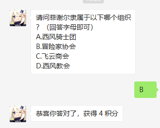 《原神》游戏中的每个职业都有自己的背景故事,他们会在游戏中的某个势力担任一定的职务,今天的微信每日一题是:请问菲谢尔隶属于以下哪个组织?下面小编就给大家带来《原神》2021年4月15日微信每日一题答案,一起来看看吧!