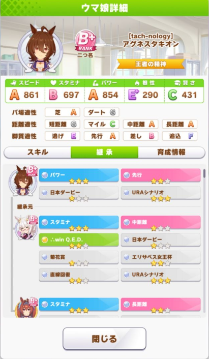 请务必将四个距离的适性全部提升到A!这个看起来要求很高,但其实不难达成,只需要1英里、1中、2长四个因子即可(其中两个长距离因子要从属于不同种马)。至于蓝因子就看个人喜好来搭配了,我的搭配都在图中 各位可以参考。(其实还是因为要凑距离适性)