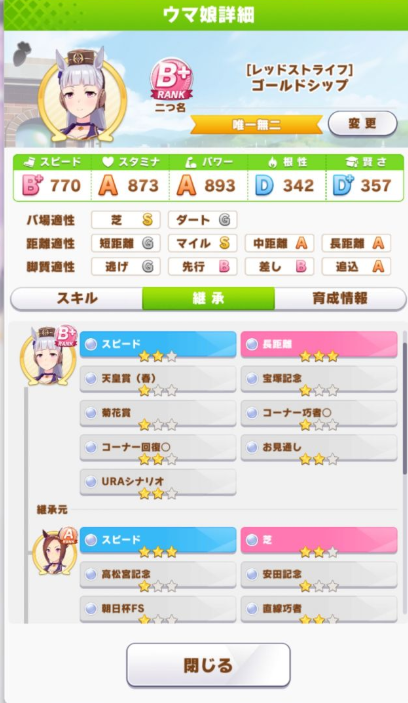 育成方面没有什么要特别注意的,按照正常的中长距离先差马来养就好,虽然本人菊花赏500耐力2普通回复技能依然输给了星云天空和特别周,沦为陪跑光环(当然由于这两个人的比赛次数严重溢出基本可以放弃) 但是请务必确保第三年的天春拥有600耐力和1金回,基本跑先都没有问题,可以8马身碾压麦昆。(麦昆:?)