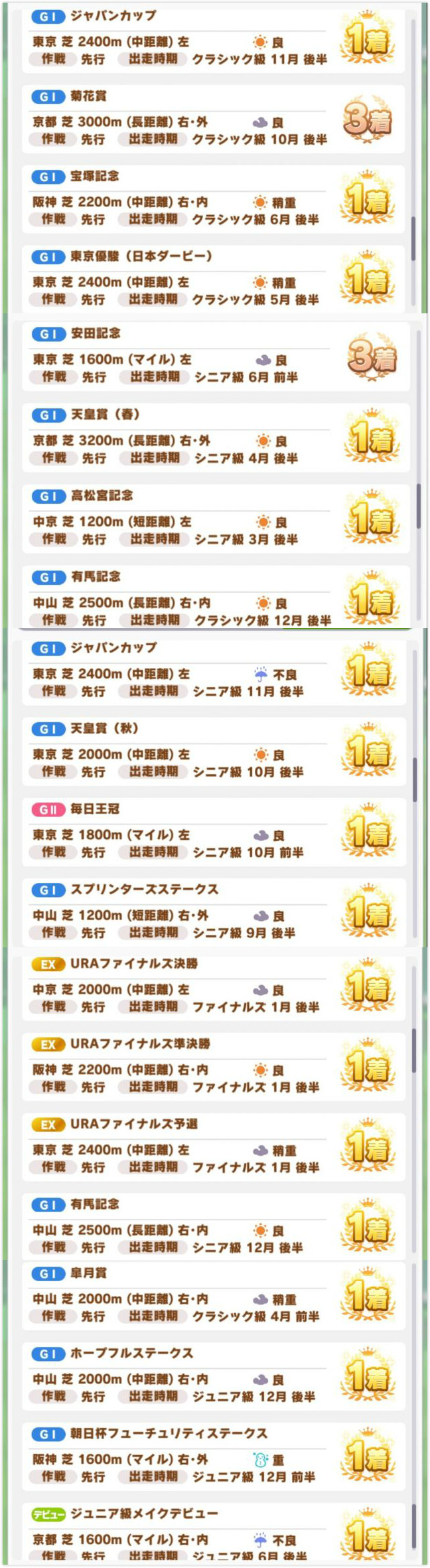 虽然二名要求战胜星云天空、特别周、草上飞;神鹰各3次及以上(我在这里理解为取得第一的比赛中这四个人出现的次数分别达到3次及以上),但是由于中长比赛中经常出现星云天空和特别周,导致和这两个人的交手次数严重溢出(粗略统计星云天空大约交手6次,特别周5次以上),因此这两个人的比赛只要不翻车两次及以上都没有问题。