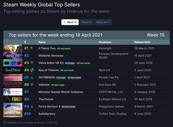 V社公布了上周(4月12日至4月18日)Steam平台的销售情况排行榜。合作游戏《双人成行》打破了《先驱者》的连冠,成功获得第一名,该作也获得了玩家和媒体的一致好评。第二名则是P社旗下策略游戏《群星》的新DLC“Nemesis”。第三名是V社的Valve Index VR套件。