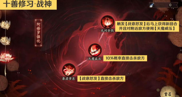 通关鬼域征伐后会获得苏摩酒(每次通关可以获得一个),也就是技能点,在修习中加点可提高战斗力。共有三种类型的buff可供解锁:【圣帝】【谋士】】【战神】