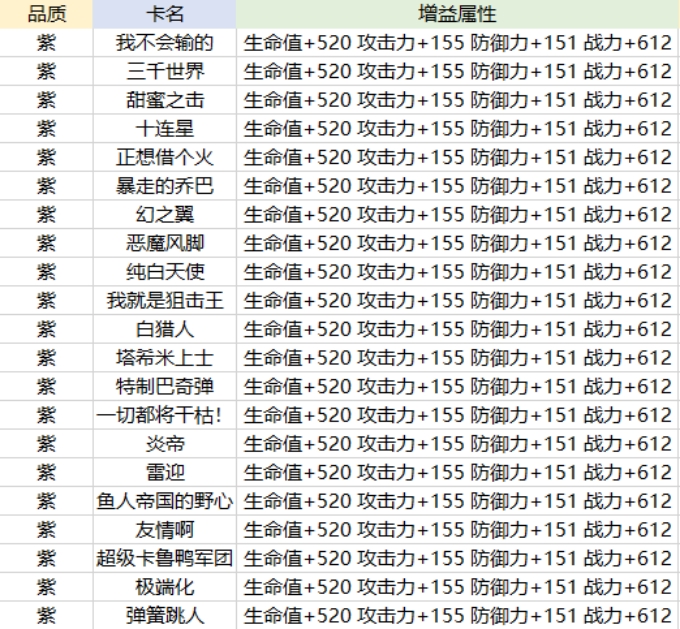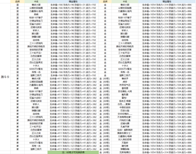 激斗卡同一个伙伴会有两种,不同的激斗卡所激活的技能是不同的,同时其属性增益也是不一样的。同一种激斗卡是根据品质(颜色)区分,从低到高为蓝色、紫色、金色,品质越高,属性和效果也就越强。(效果为附加技能特性)▶获得方式:勇者挑战(勇气商店),提升伙伴亲密度。▶详细数据: