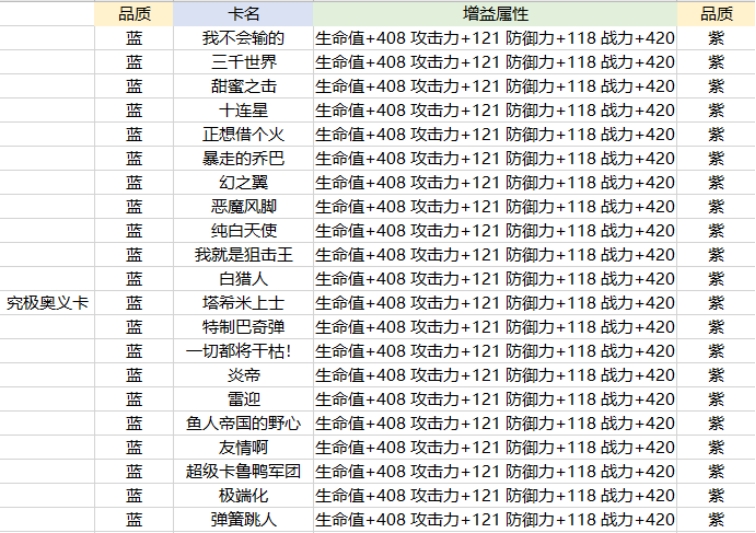 奥义卡(究极)同样以蓝、紫、金的品质区分,但不同的是奥义卡所赋予的技能效果不会加强,仅增强属性。▶获得方式:勇闯推进城,提升伙伴亲密度。▶详细数据:
