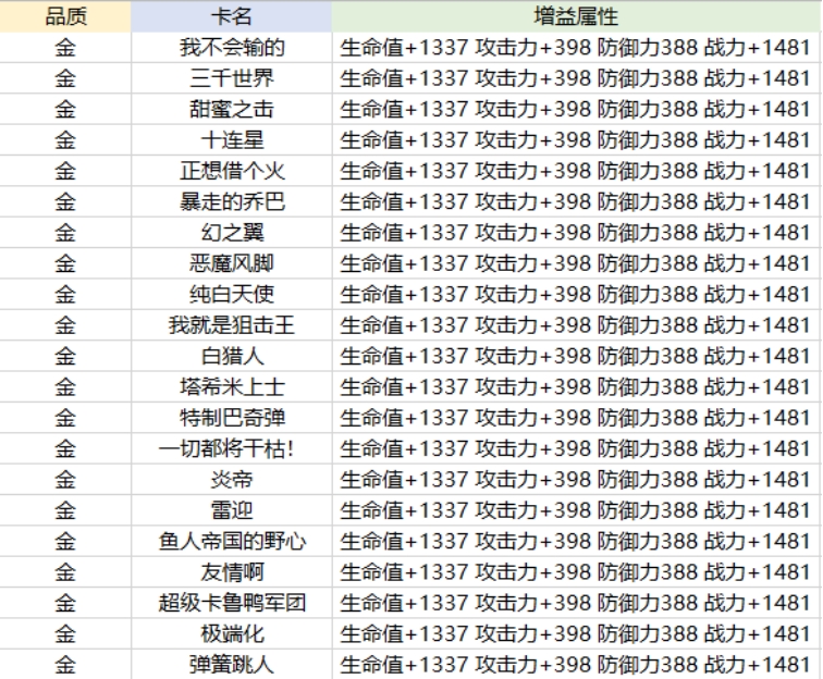 同一种战意卡所赋予的属性增益是不同的,Ⅰ、Ⅲ提供攻击和防御属性增益,而Ⅱ提供生命值属性增益。