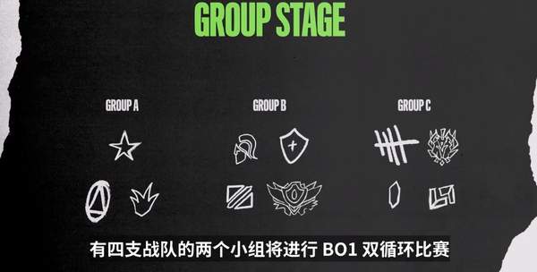 小组赛阶段,所有队伍按照 3/4/4 的队伍数分成三组,有四支战队的两个小组将进行 BO1 双循环比赛,有三支战队的小组则在组内进行 BO1 四循环比赛,每组前两名晋级对抗赛阶段。