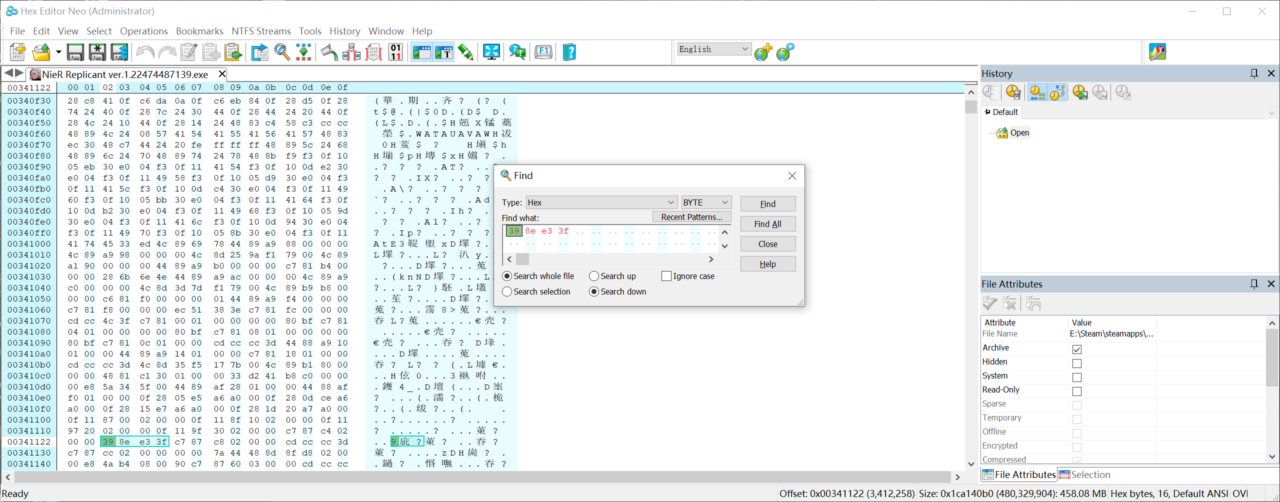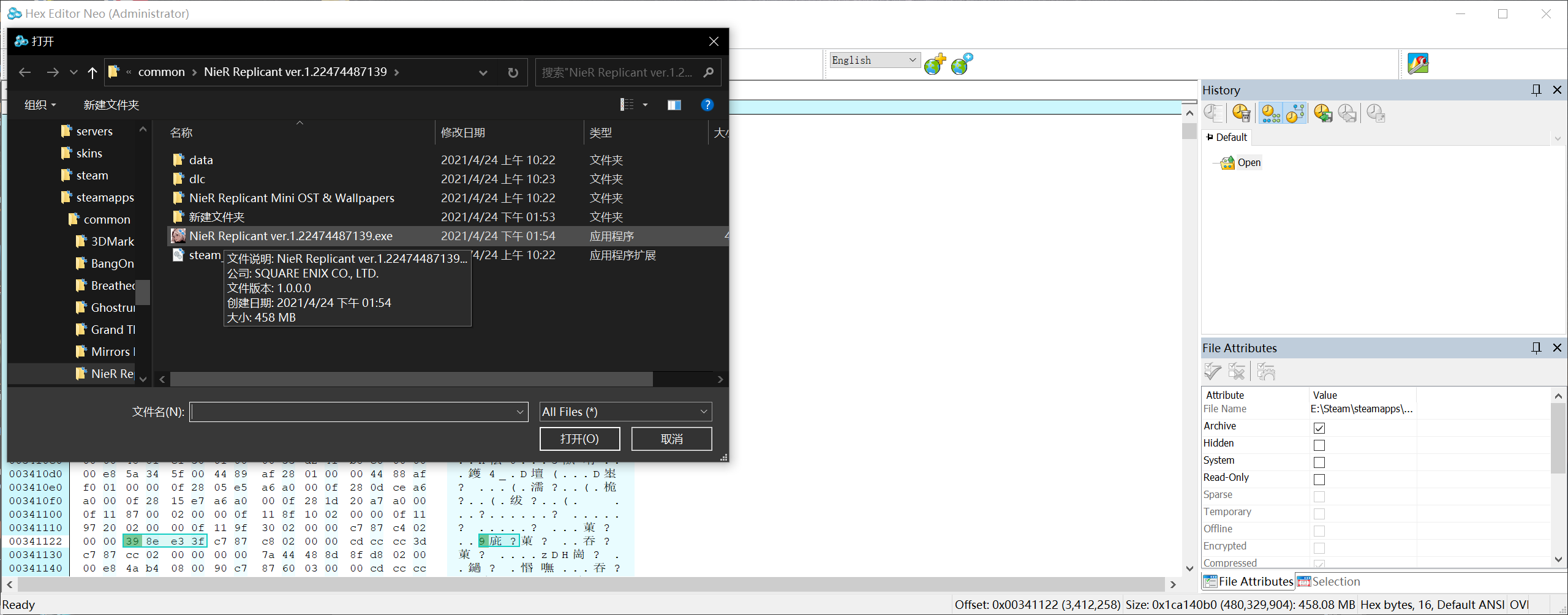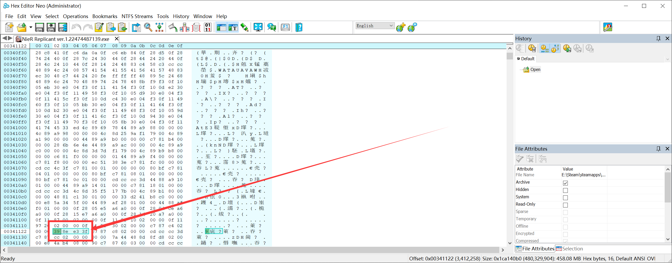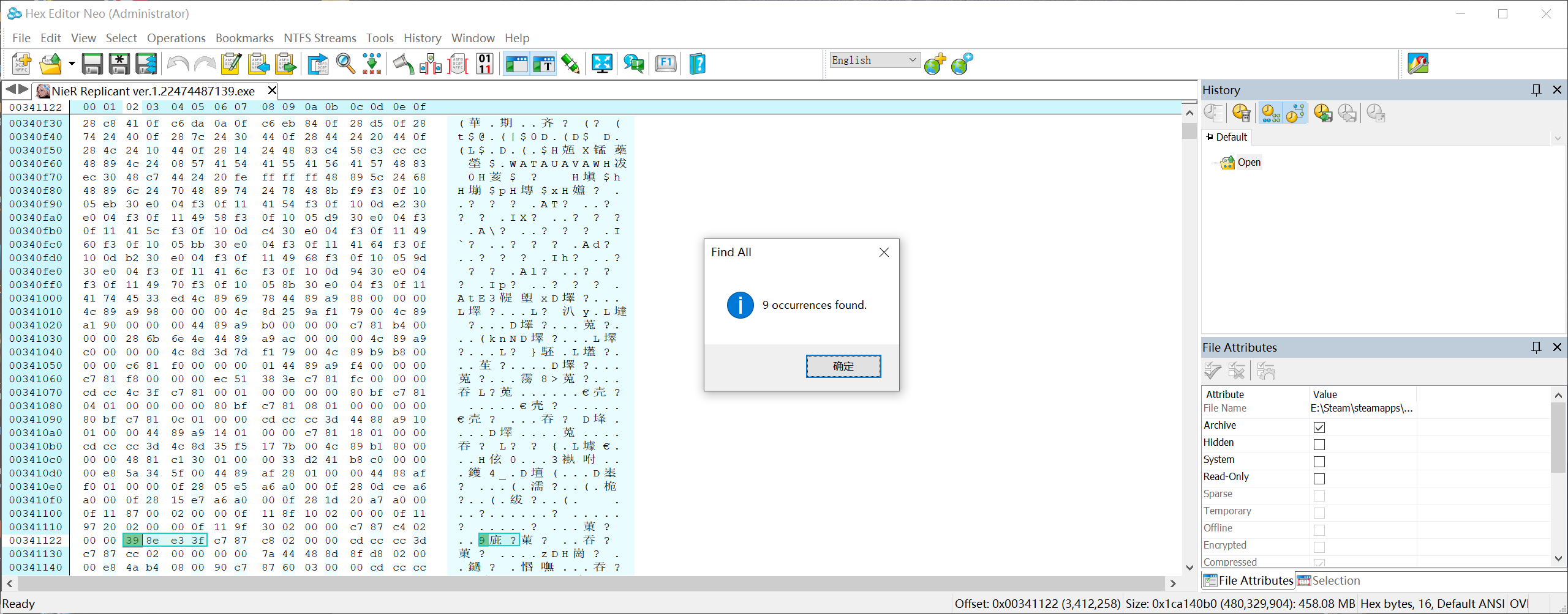 用Hex Editor Neo或者类似的16进制编辑器打开尼尔1.22的exe。
