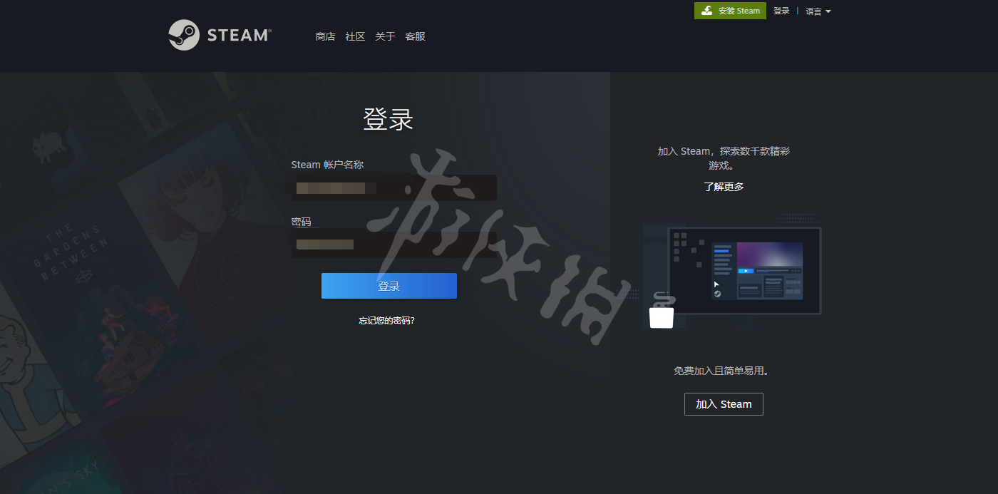 这里会需要登录账号,直接登录即可,没账号的可以点击右边的加入steam创建账号。