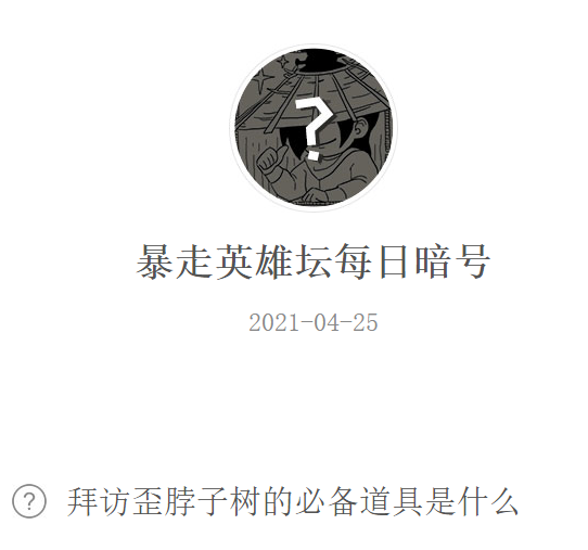 《暴走英雄坛》官方微信公众号每天都会推出了一个暗号问题,玩家可以在游戏中回答暗号获得丰富的道具奖励,今日《暴走英雄坛》微信每日暗号是:拜访歪脖子树的必备道具是什么?下面小编就给大家带来《暴走英雄坛》2021年4月25日微信每日暗号答案分享,一起来看看吧!