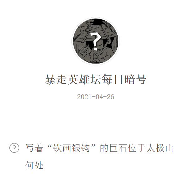 《暴走英雄坛》游戏中有很多的标志建筑,游戏场景中还铭刻了各种诗句,武学招式等等,今日《暴走英雄坛》微信每日暗号是:写着“铁画银钩”的巨石位于太极山何处?下面小编就给大家带来《暴走英雄坛》2021年4月26日微信每日暗号答案分享,一起来看看吧!