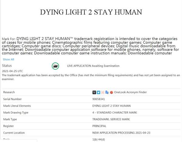 根据Reddit网友爆料,结合了跑酷与僵尸生存的沙盒游戏《消逝的光芒2》在美国申请注册《DYING LIGHT 2 STAY HUMAN(消逝的光芒2:坚守人性)》商标,商标用途为“电子游戏软件”。目前官方并没有说明这个商标到底用在哪里,很多人猜测这或许就是游戏的正式名称。