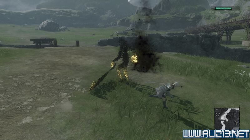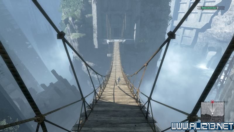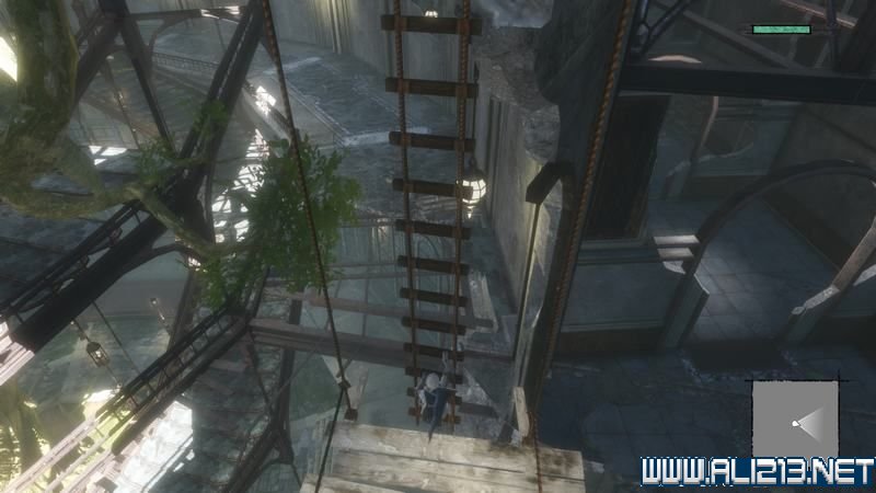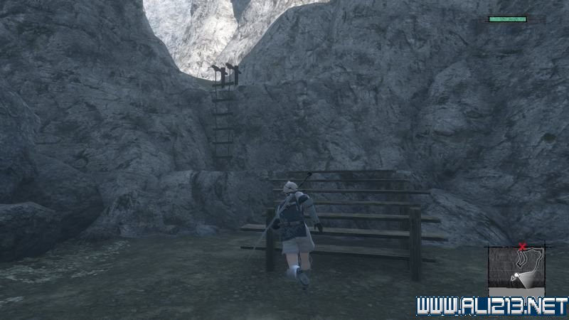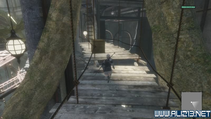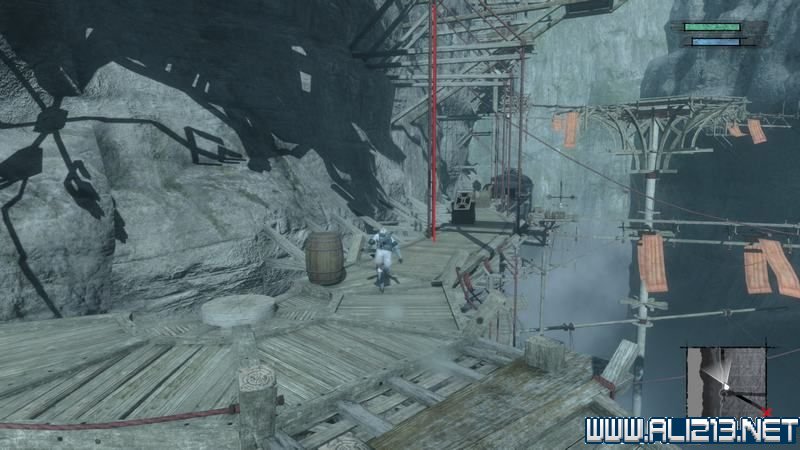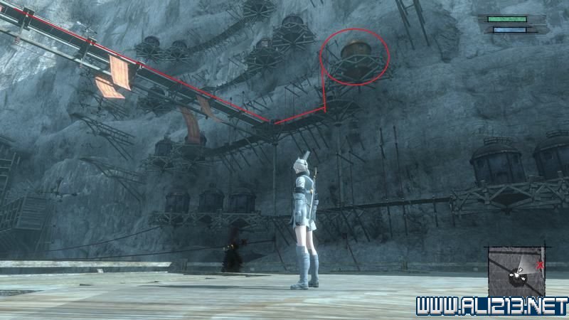 通过桥梁到对面,沿着红线楼梯爬上去就能前往上方桥梁。