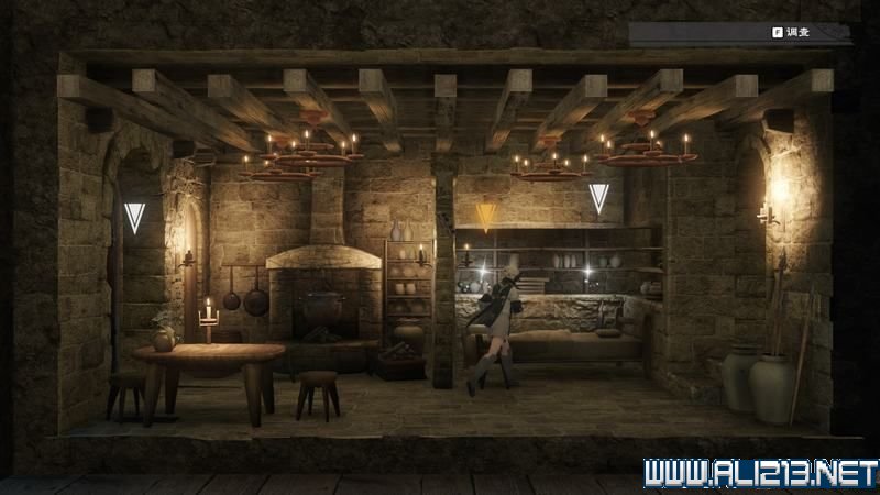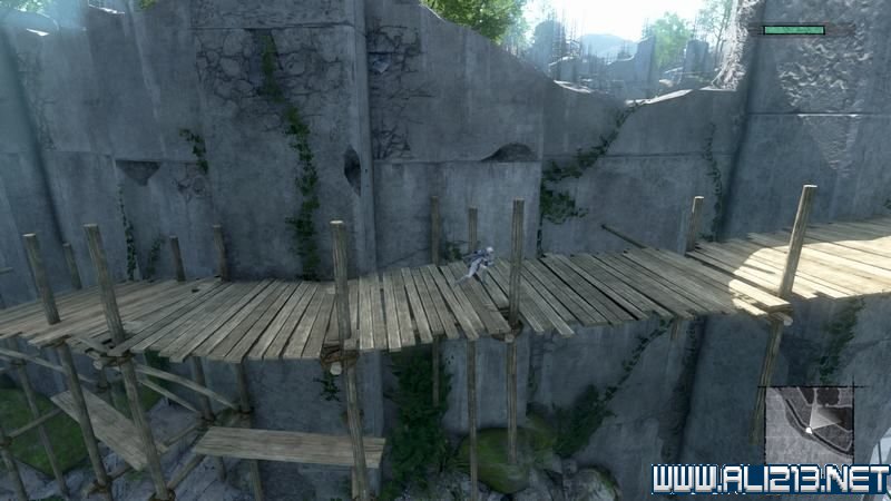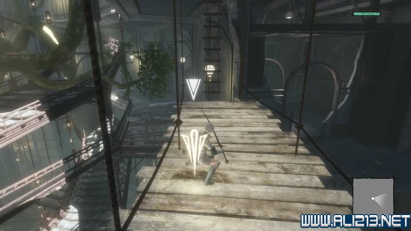 走通房间后可以继续向上,道路受阻后继续走外圈房间,爬上木桥。