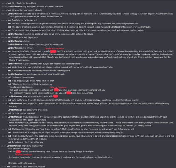 拳头公司同时也否认关于曾经“威胁”Chronoshift上缴游戏文件和代码的说法。然而详细记录的聊天记录里,拳头员工Zed咄咄逼人冷嘲热讽的说话方式也引起了国外网友的嗤笑。