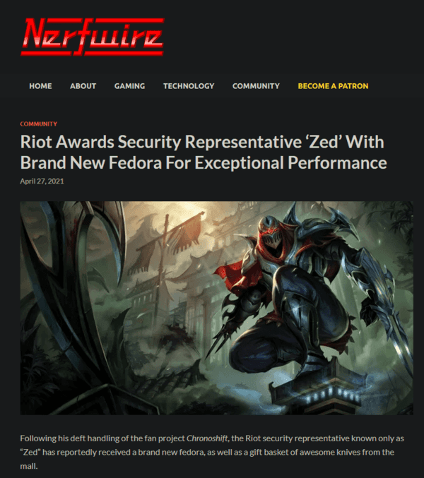 国外网站Nerfwire甚至发布恶搞新闻,来嘲讽拳头员工Zed在和Chronoshift制作者交流时的说话方式。