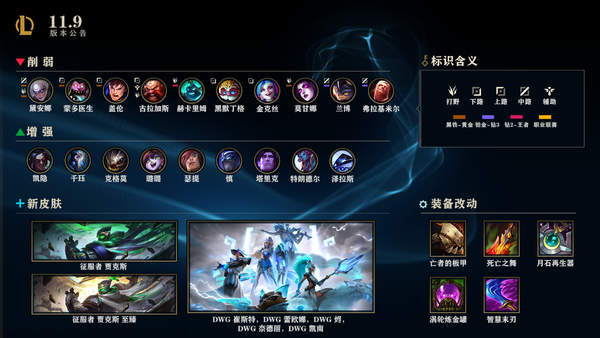 随着4月步入尾声,5月将至,《英雄联盟》国服在今日(4月29日)凌晨进行了11.9版本更新,一系列装备、英雄改动实装,此外全新的“DWG 烬”、“DWG 奈德丽”、“DWG 凯南”、“DWG 蕾欧娜”、“DWG 崔斯特”、“征服者 贾克斯”、“征服者 贾克斯 至臻”皮肤已在11.9版本内,静待上架发售。