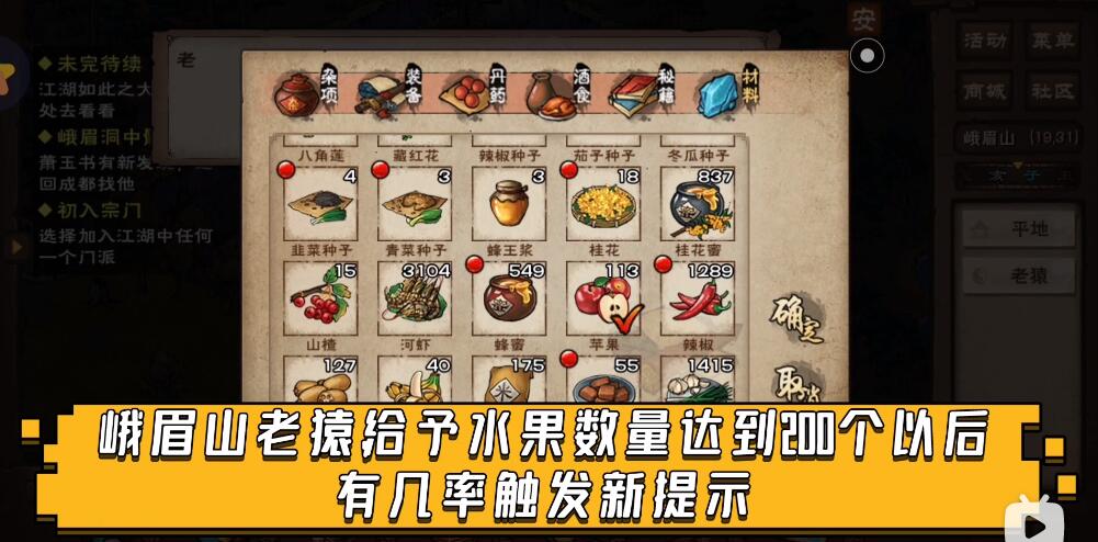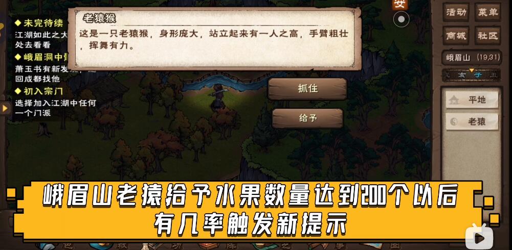 1、玩家在新地图峨眉山,找到老猿,然后一直给老猿送水果,送到200个以后就有几率触发任务。