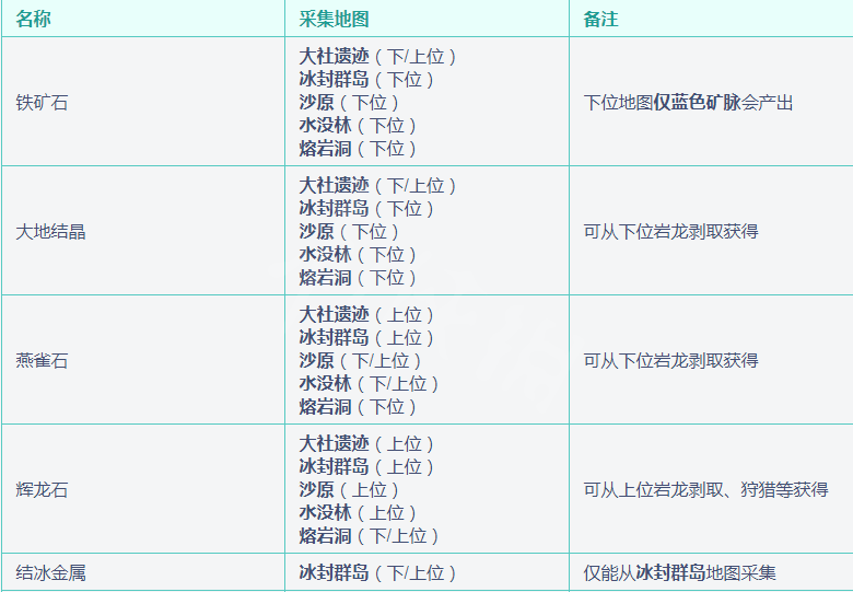 矿物可在各地图的矿物采集点采集,部分矿物为地图独特产出。