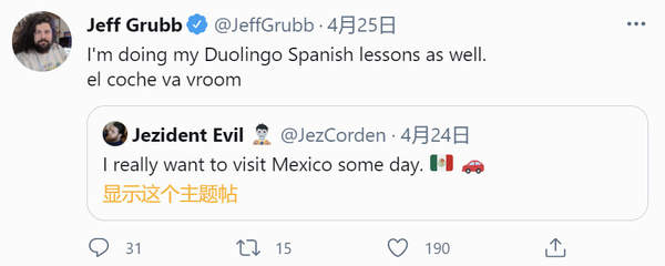 上周,Corden发推说自己想在某一天去墨西哥旅游,后面有一个墨西哥国旗和汽车表情。后来Ventures Beat记者Jeff Grubb在他的最新一期播客节目中给出了自己的想法。