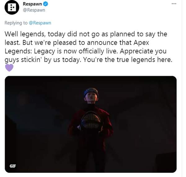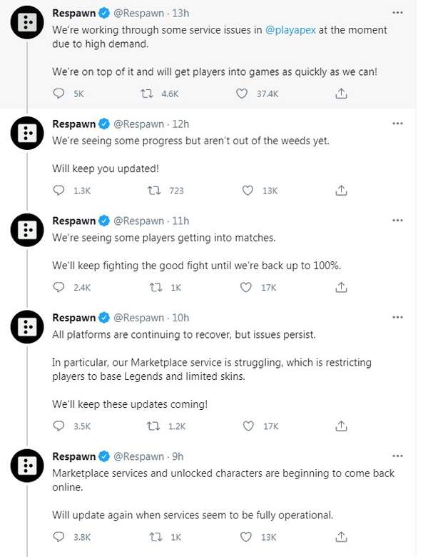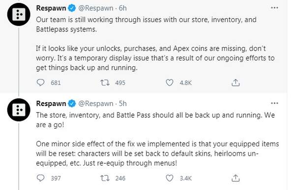 重生工作室的推特从问题出现开始便一直在更新动态。五个小时前重生宣布商店、物品栏、通行证等物品已全部修复可以使用。到目前为止,登录问题已基本得到解决(只是非常卡),匹配系统基本可以正常工作(跟正常时段相比还是卡),某些玩家依然声称自己的皮肤、传奇解锁和金币还是清零的状态。