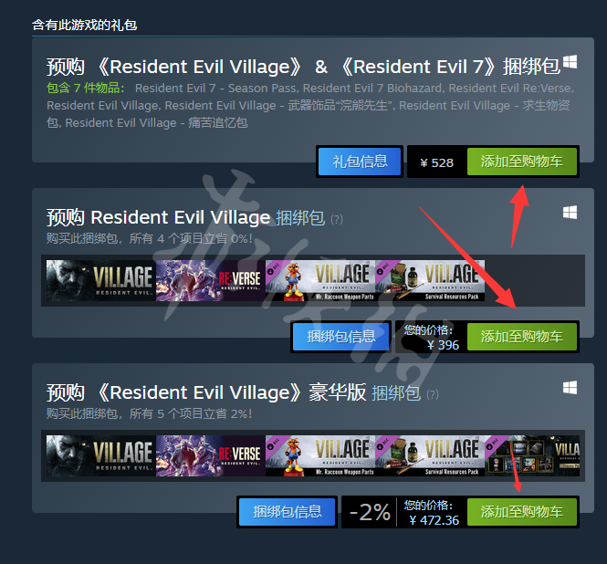 首先点击上方steam地址进入steam页面,进入后可以选择下面的几个版本预购,第一个是7+8合集包,第二个是游戏原版,第三个是豪华版。