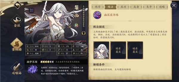 1.5倍单体伤害技能,对战前施加[幽阙](禁疗,无法驱散);若目标身上携带2个及以上负面状态,则法穿提高50%。