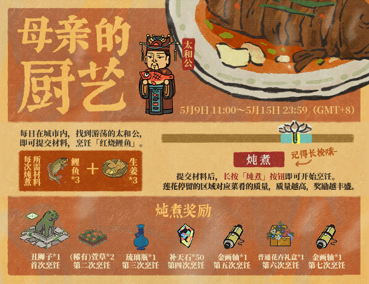 每日在城市内,找到游荡的太和公,即可提交材料,烹饪「红烧鲤鱼」。