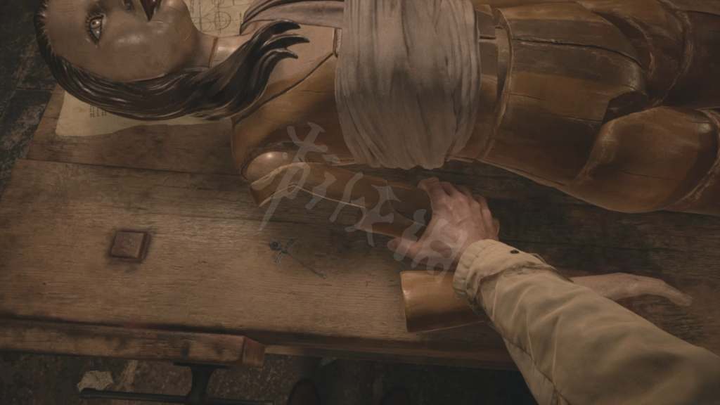 玩家会在地下室内发现一个木头人偶,玩家可以在木头人偶上找到一个染血的戒指,人偶的右手中有一把银钥匙,左腿处有一把钟表钥匙。